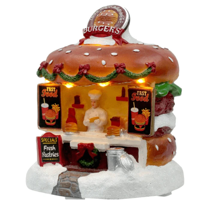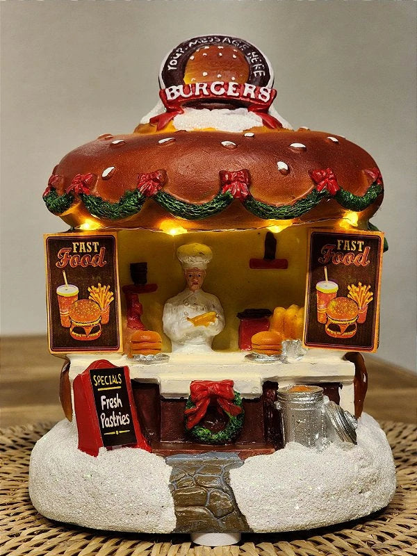 Adicione um toque de criatividade e diversão à sua vila natalina com a encantadora Loja Natal Hamburgueria. Com um design lúdico em formato de hambúrguer, esta peça única vai transformar sua decoração de Natal em um verdadeiro espetáculo. A loja, iluminada internamente, destaca o chef em ação e traz detalhes que remetem ao mundo dos fast foods, criando uma atmosfera calorosa e festiva. É perfeita para aqueles que desejam um cenário natalino repleto de originalidade e charme.