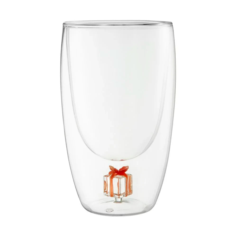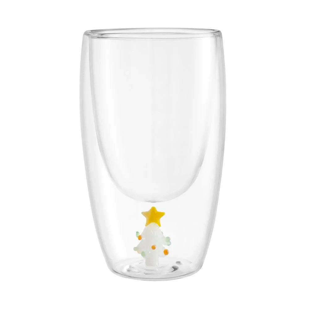 Copo Alto Arvore de Natal tem capacidade de 350 ml e é produzido em vidro borossilicato, um material leve e resistente. Com parede dupla, não esquenta o vidro externo dando mais conforto ao manusear. No clima natalino, na base do copo um delicado pingente está fixo por uma haste entre as paredes do copo.